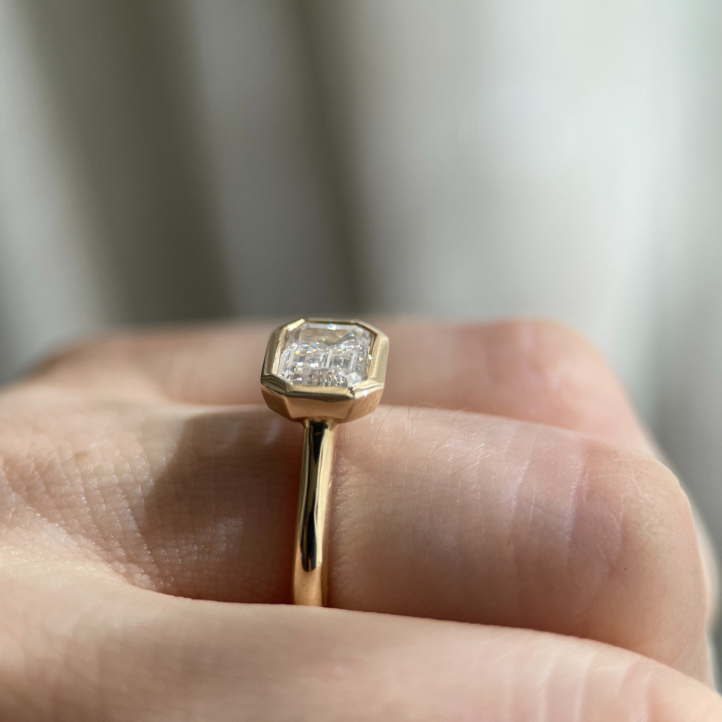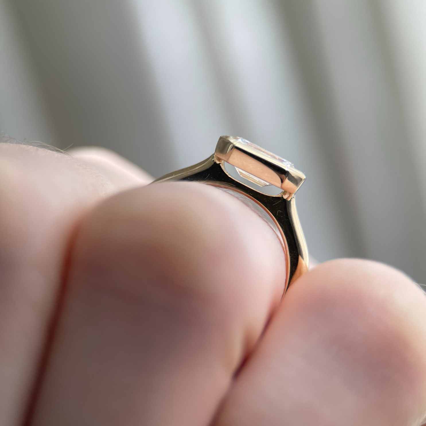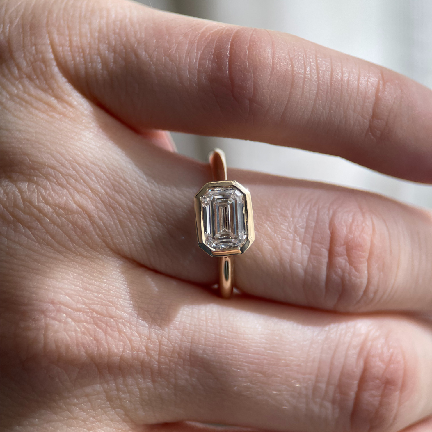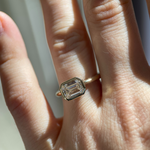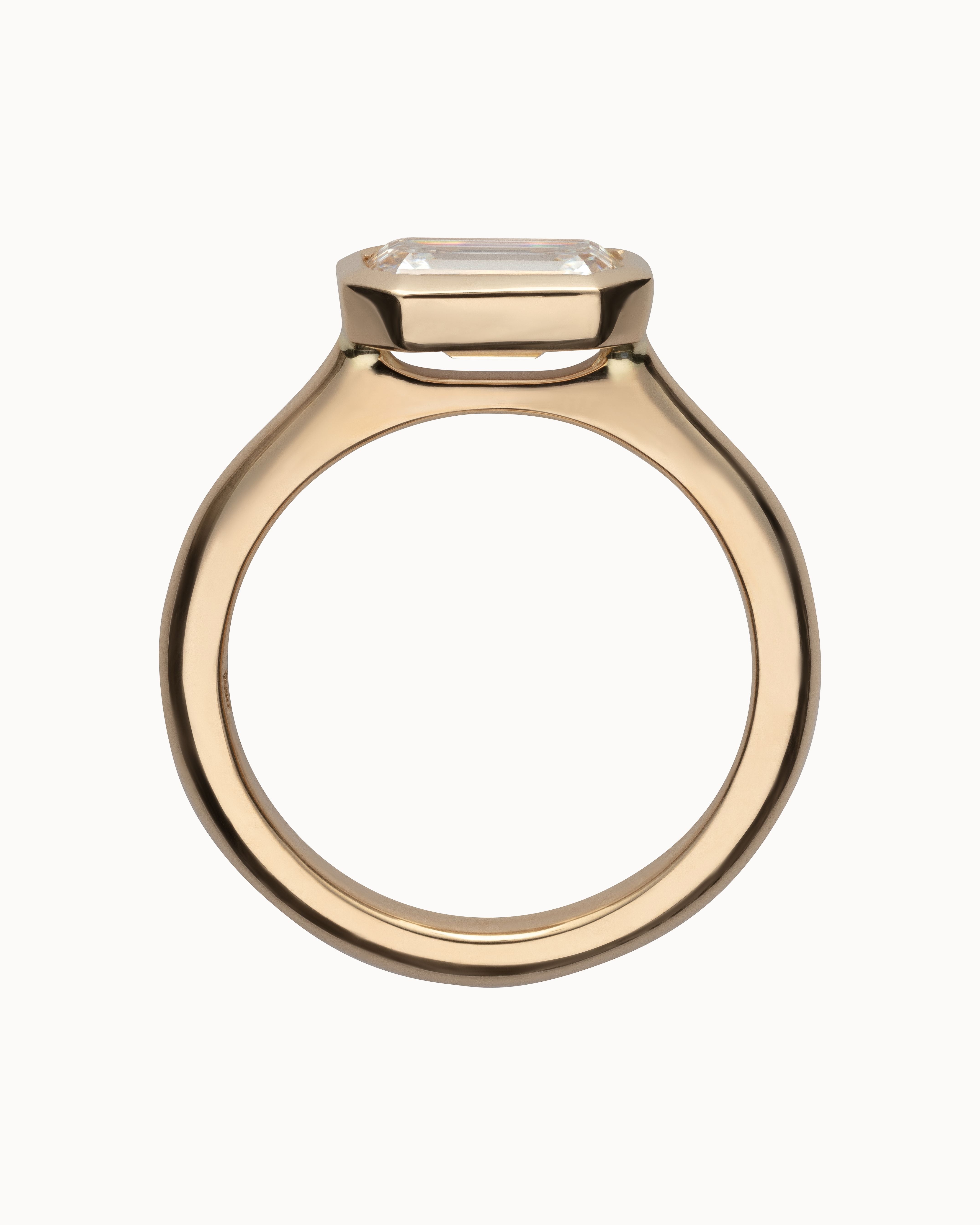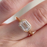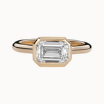 The Romy Ring pairs the sleek geometry of an emerald cut with the lustrous gold framing of a bezel setting. Its east-west orientation feels quietly confident - understated, yet striking. Designed to stack effortlessly, whether with bold gold or sparkling ring sets.