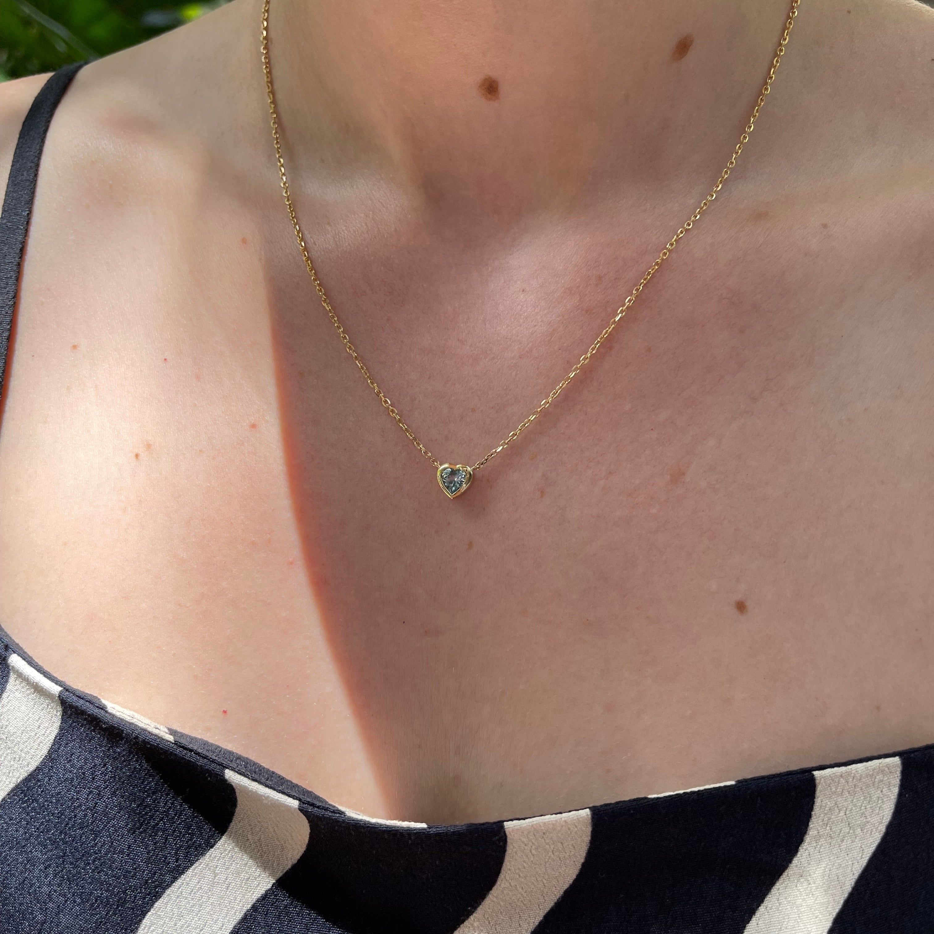 A vibrant 5mm blue natural aquamarine heart set in lustrous 9ct yellow gold. This necklace is 45cm long, on a diamond cut cable chain.