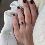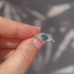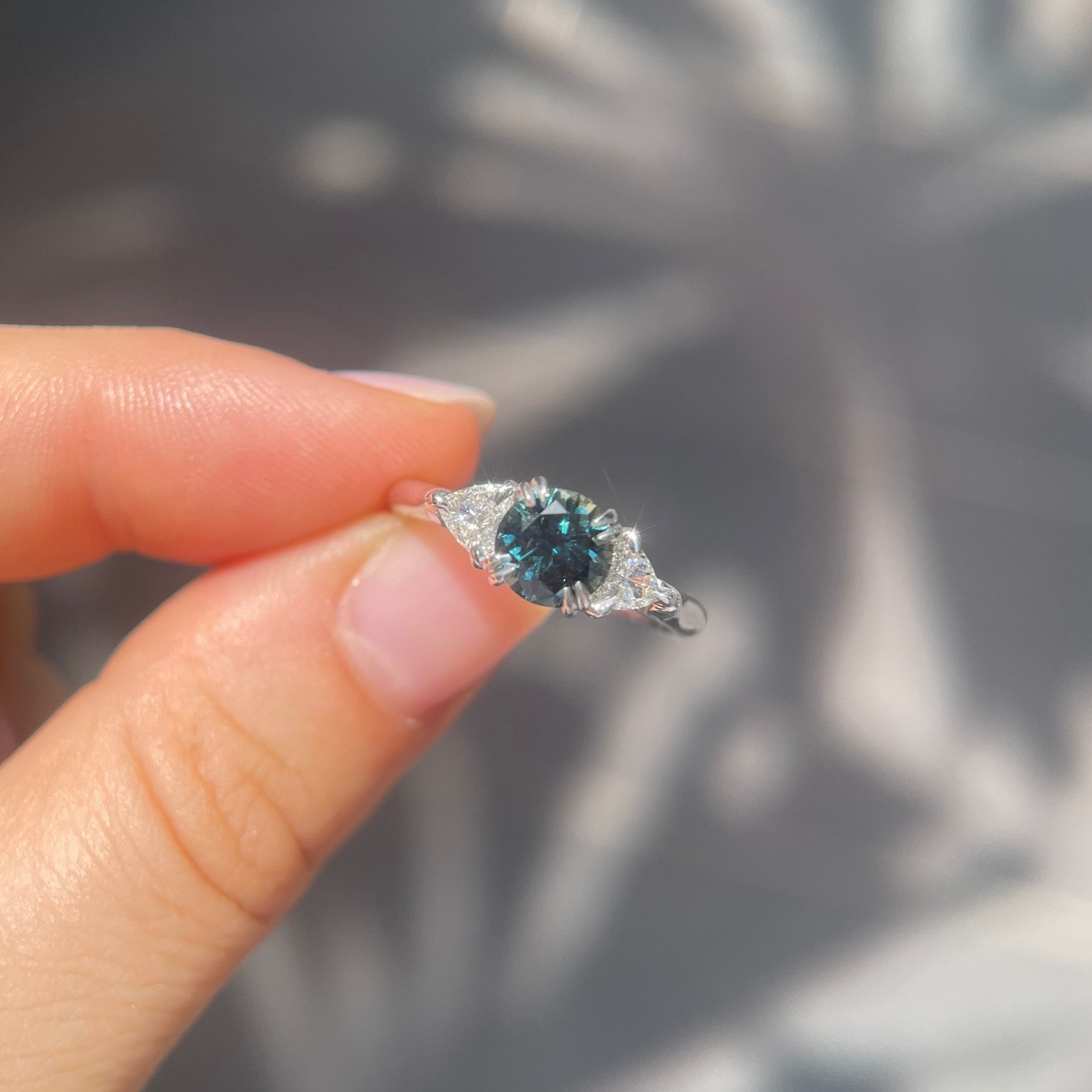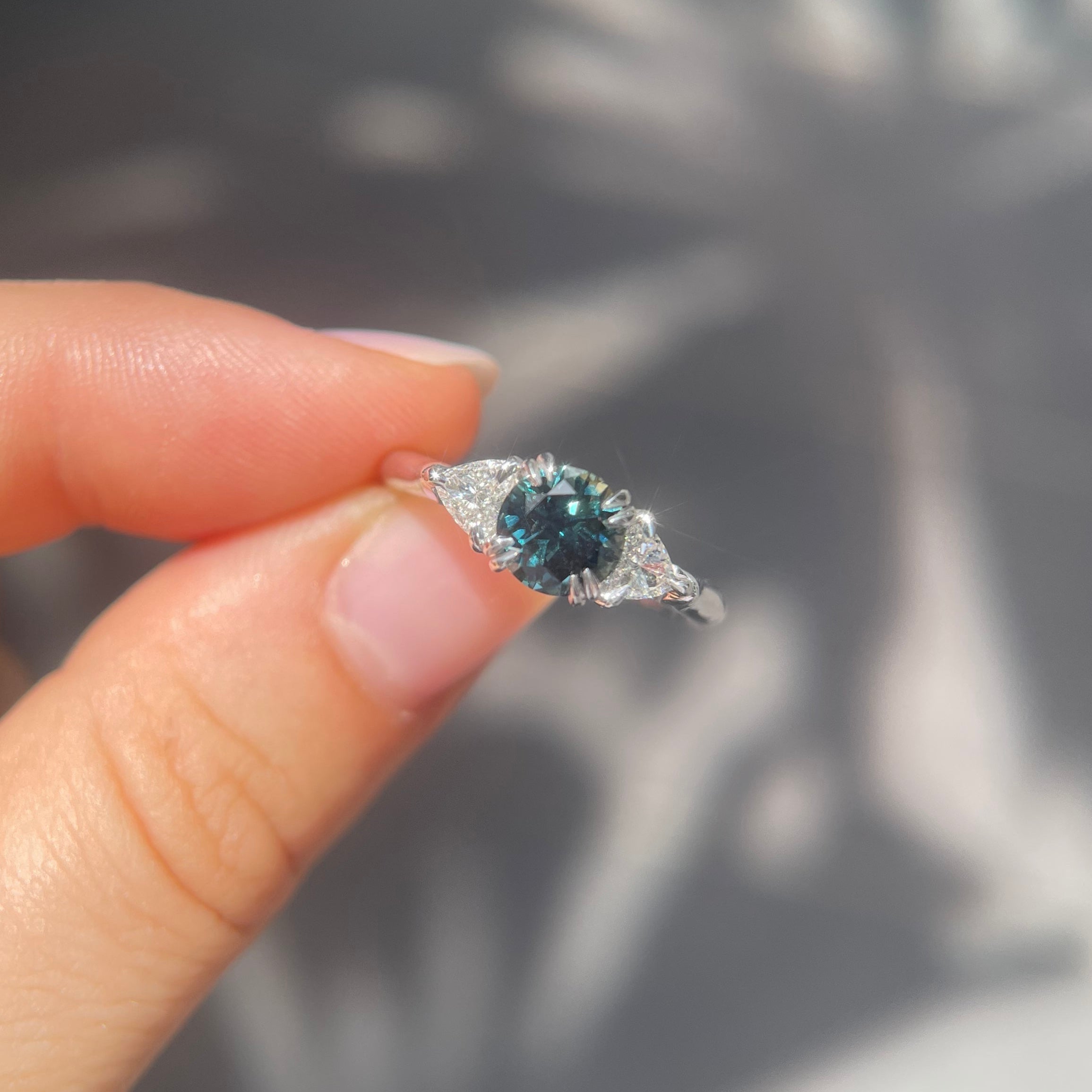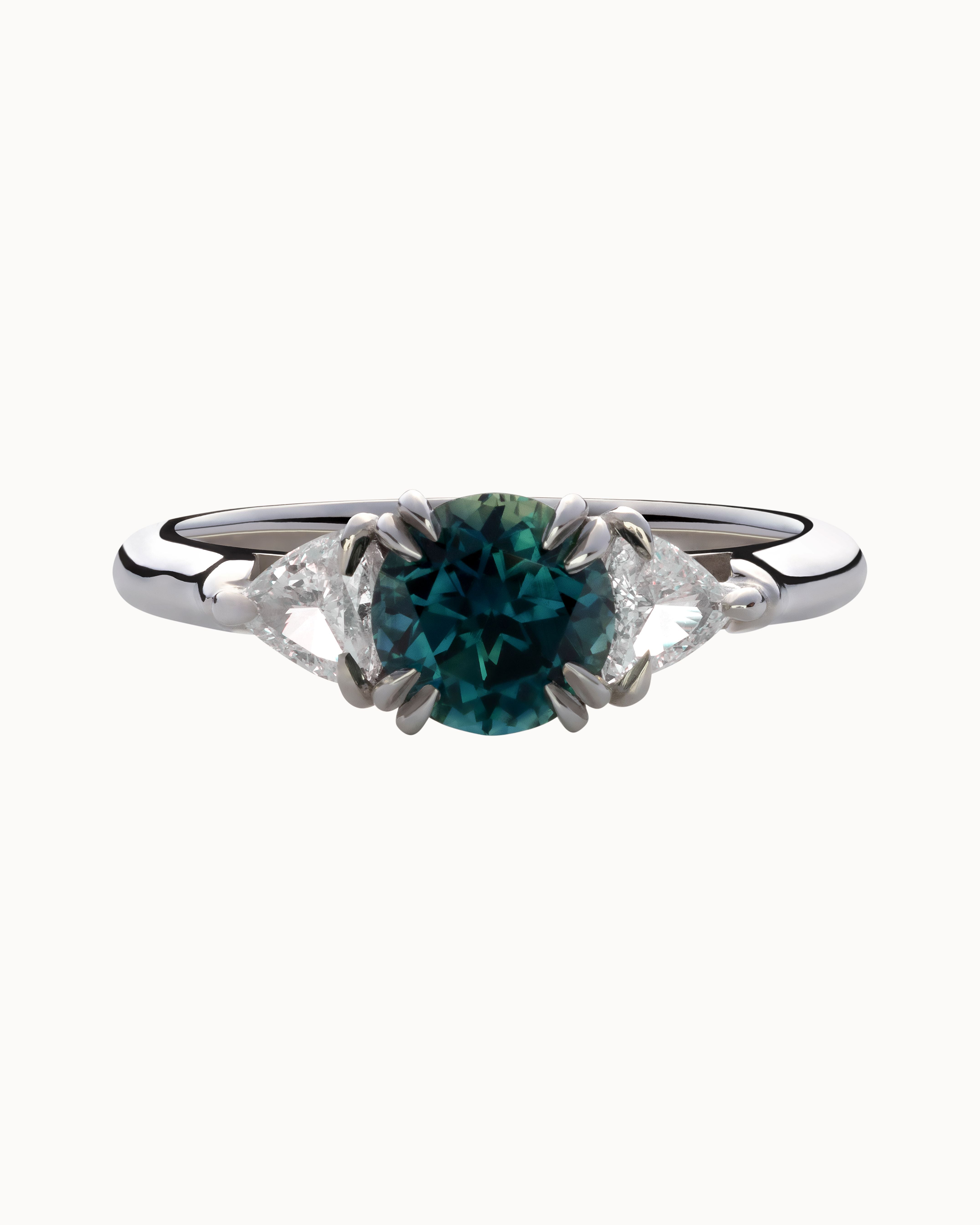 A stunning 1.58ct natural teal Sapphire hand-mined from the Queensland Gemfields, set within a trilogy design alongside 2 natural trillion diamonds.
