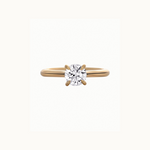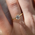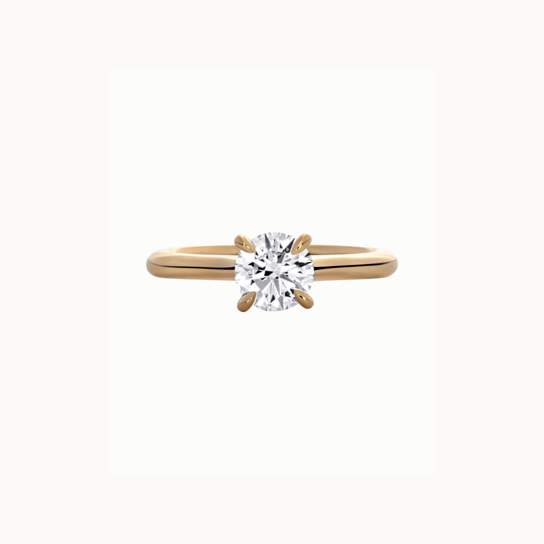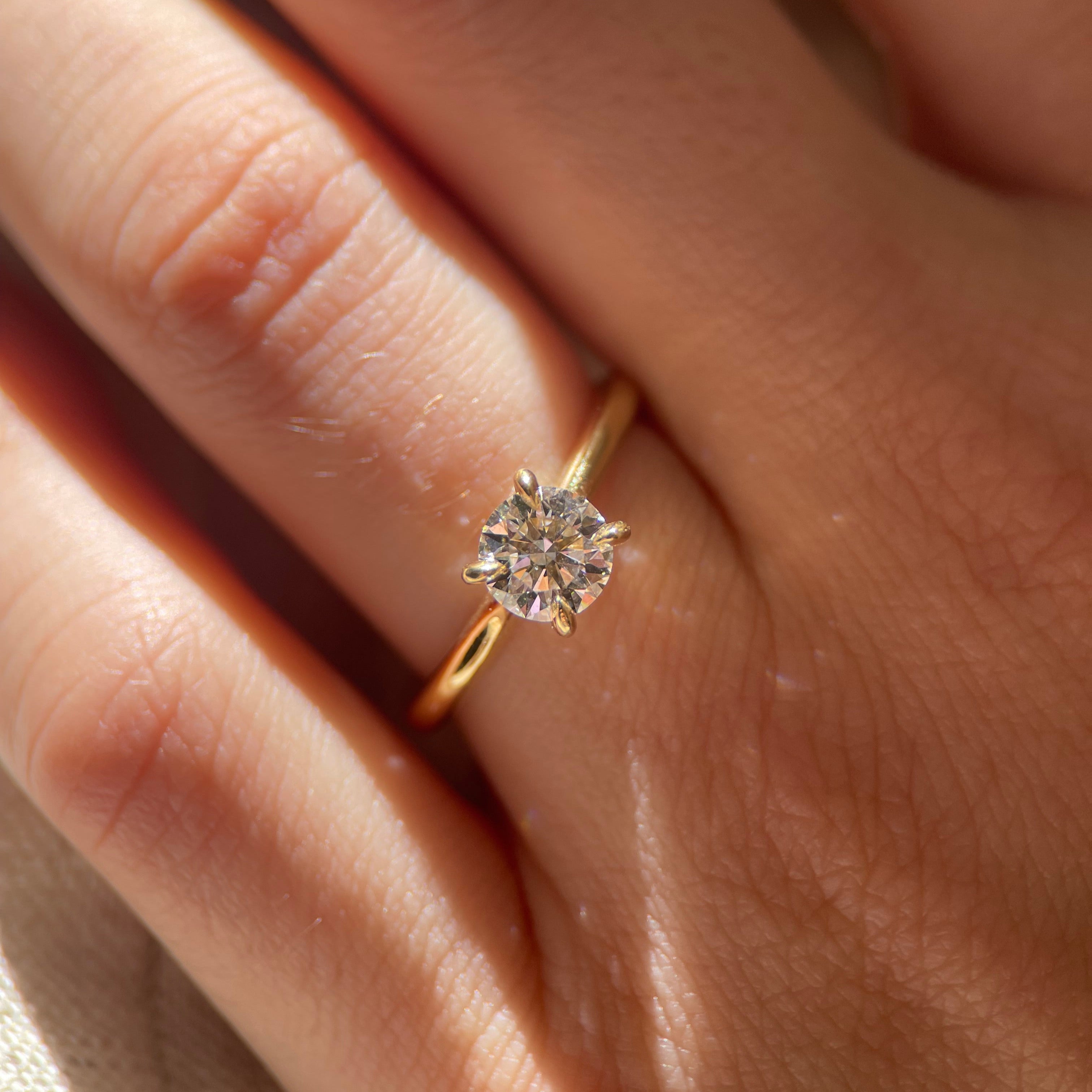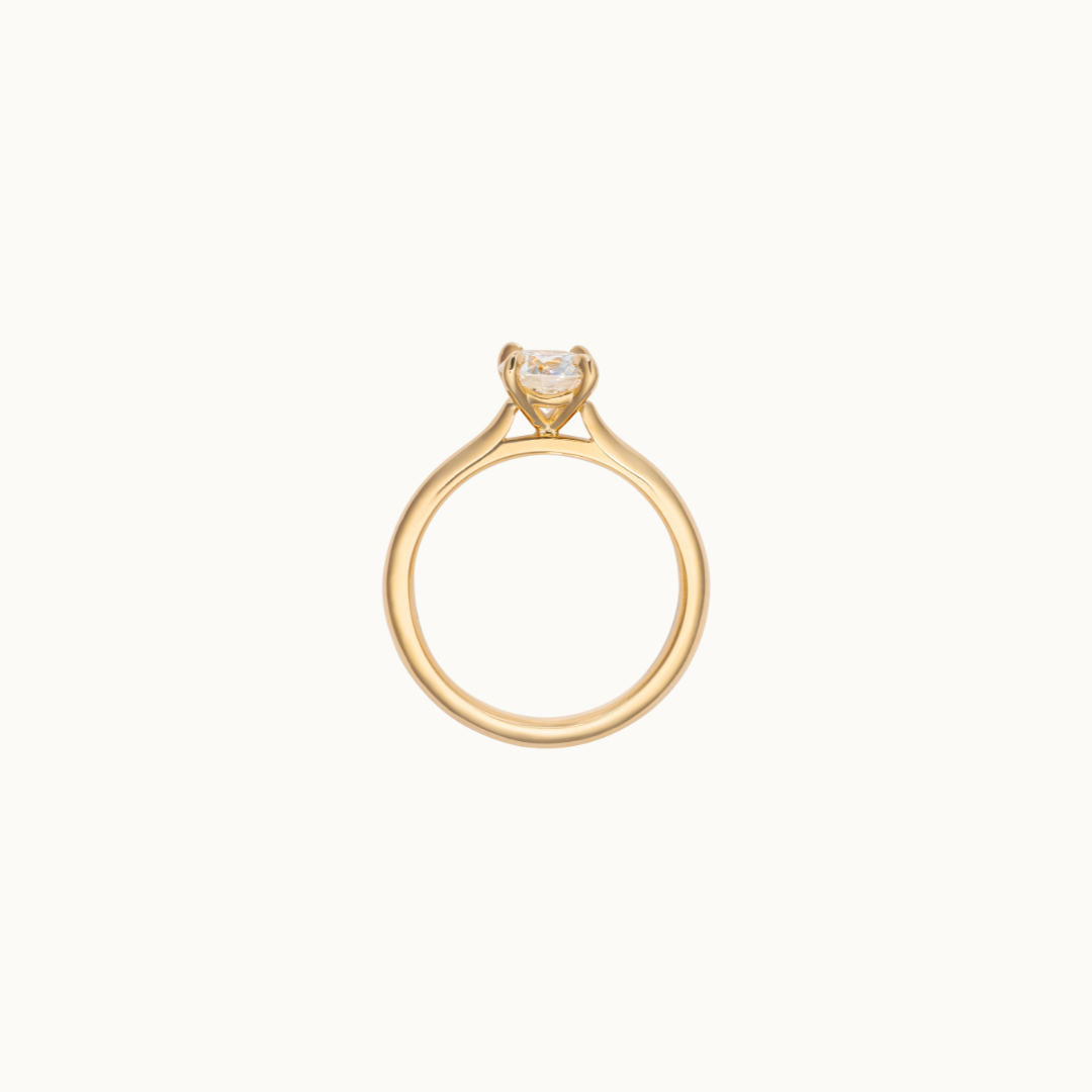 The Aurelia Ring is a classic round solitaire featuring a four-claw setting and straight band that flows up beautifully in a cathedral style.