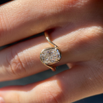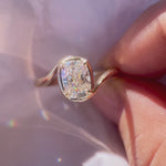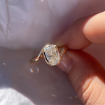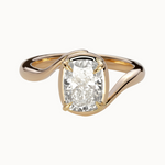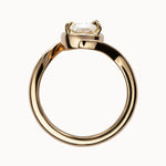 The Avery Ring features a sculptural split shank that sweeps upward to cradle the diamond from both above and below - a fluid, organic silhouette. A subtle faux bezel frames the base of the stone in warm gold, balanced by four fine pointed claws for a softly structured finish.