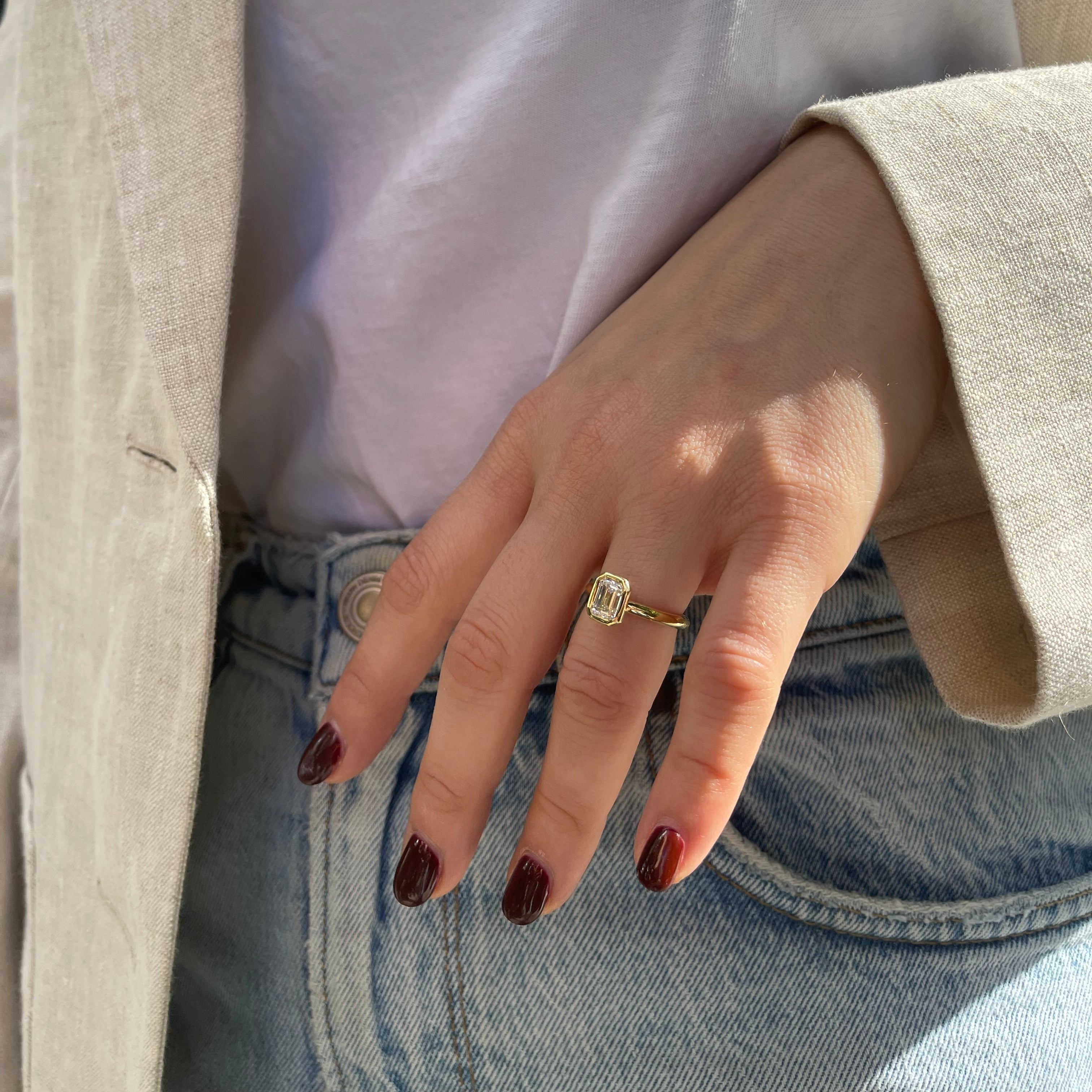 This Mila Ring features a 1ct lab-grown diamond in a bezel-set solitaire with a floral basket design.