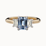 Set between two natural emerald-cut diamonds, the trio forms a timeless silhouette that speaks to refined taste and quiet luxury. The subtle pop of sapphire blue contrasts beautifully with the crisp brilliance of white diamonds, creating a balanced, graceful design that feels both modern and enduring.