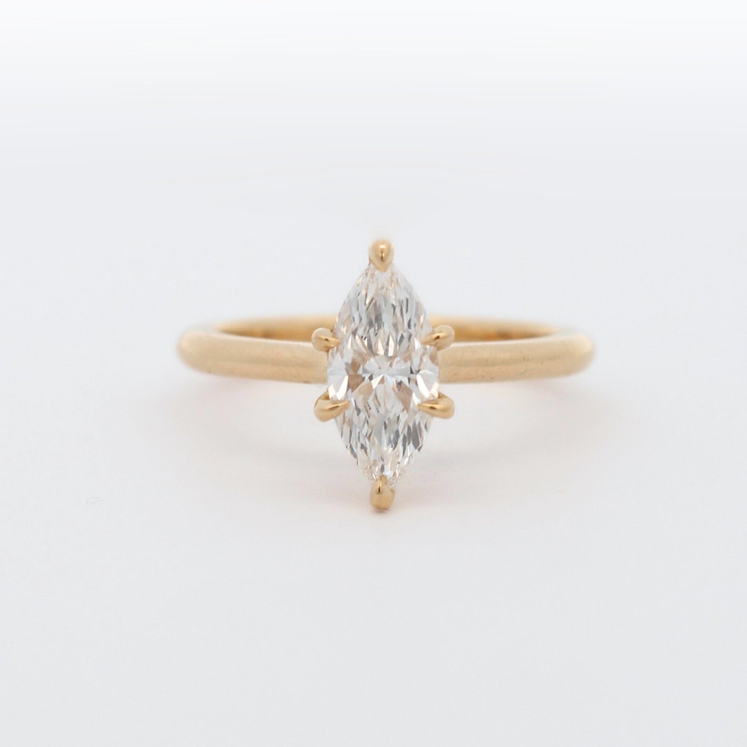 This Vera features a 1.ct E VS1 Lab-Grown Marquise Diamond in 18ct yellow gold.
