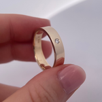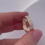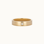 The Dimitri Wedder is a 5mm flat polished band featuring one hammer-set round diamond.
