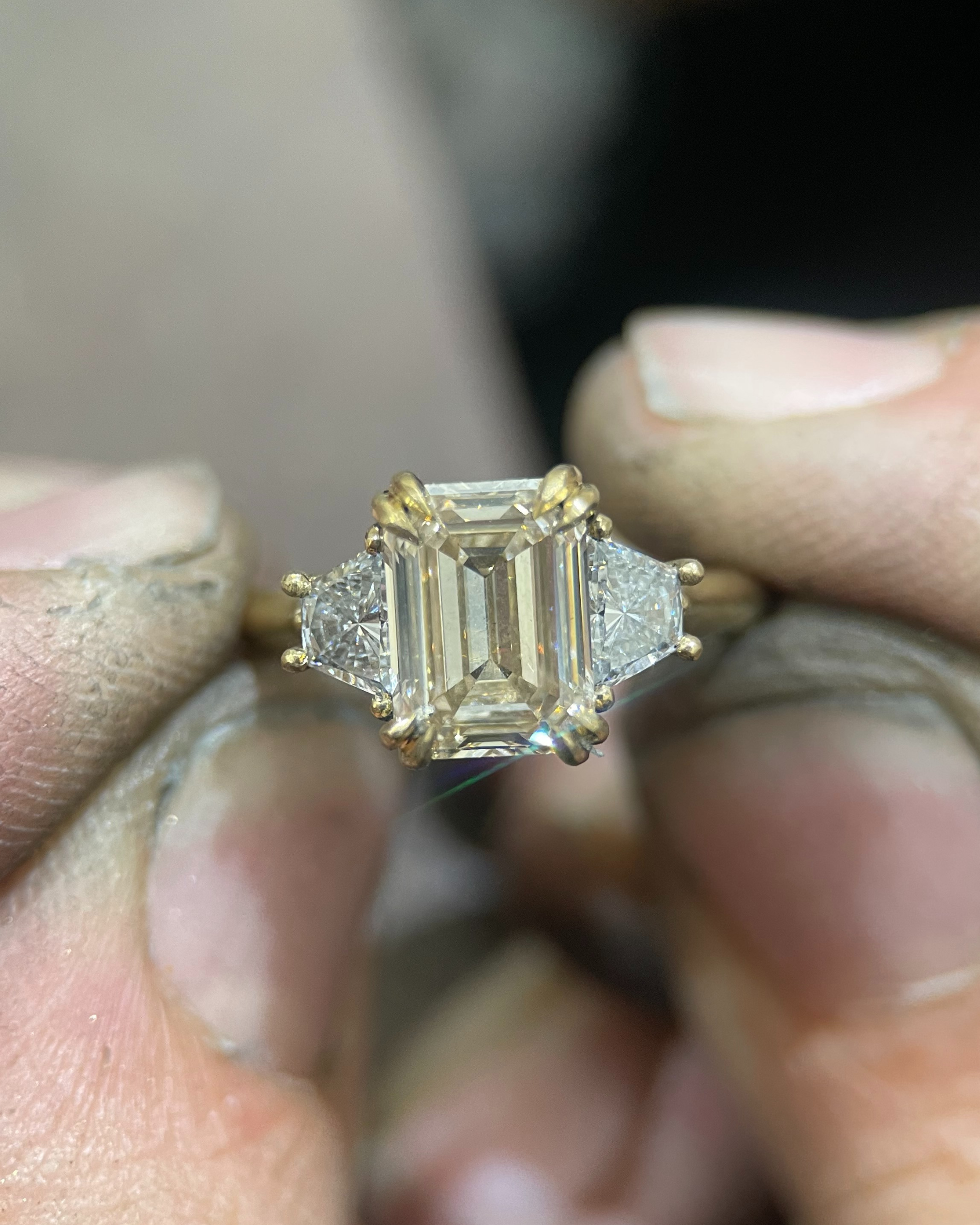 The process begins with a tailored design consult where we discuss your budget, inspiration and vision. You can try on our collections and view loose stone options.