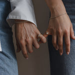Two gold wires intertwining, distinct yet almost melting into one another. At the centre, a diamond — its own origins from the Greek adamas, meaning unbreakable. Two symbols of strength, bound together.